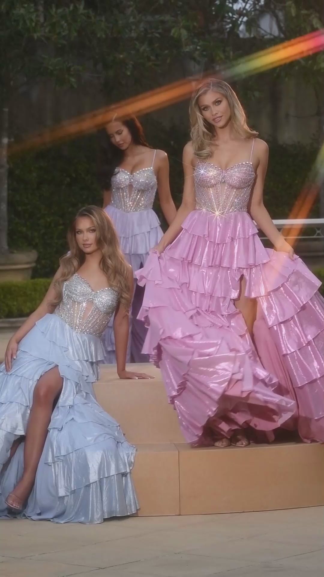 STR41 by Starielle is the sister style to STR08, this intricately beaded corset dress is adorned with heart shaped crystals and features a multi layered ball gown skirt crafted from luxurious metallic fabric. With its corset back and radiant shimmer, this best selling pageant and prom gown captures both mermaid elegance and princess charm.